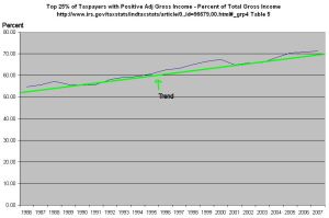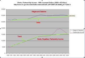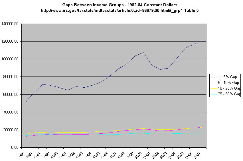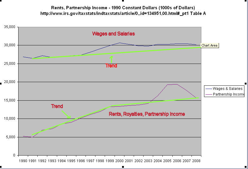 How have business owners been able to keep a lid on worker wages for these past 35 years? Supply and demand. As I noted above, GDP growth has lessened over the past three decades, reducing demand. During that period, the supply of labor has increased. In 1973, the BLS reports that there were 64 million in the civilian workforce, 40 million men and 24 million women. The civilian workforce was 30% of the population of 212 million. In 2008, the total civilian workforce had almost doubled to 125 million, 67 million men and 58 million women. This workforce was 41% of the total population of 304 million. Look at the ratio of men to women in the workforce. In 1973, there were almost two men for each woman. By 2008, the ratio approached a one-to-one ratio. As more women entered the workforce, they put downward pressure on wages, which induced more women to enter the workforce to make up for lost household income. This cycle will continue for the next two decades unless this country decides to implement policies that will return some of the lost manufacturing capacity to this country.