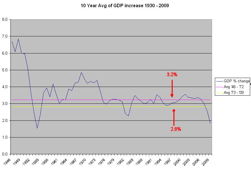 Below is a graph of U.S. GDP 10 year averages since WW2 and the averages for the periods 1946 – 1972 and 1973 to 2009. (Click to enlarge)