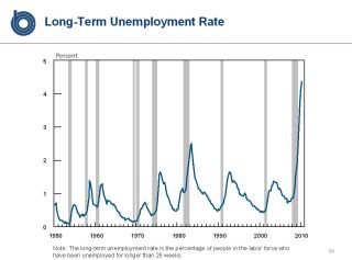 Although this recession officially ended in June 2009, the persistently high unemployment, similar to the levels of 1980 – 1983, makes the present period an equally severe period. But what makes the current malaise truly stand out is the rate of the long term unemployed, as shown in the graph below.