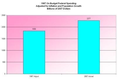 Tax collections in 2007 were far stronger than the 1987 pace BUT the federal government is spending money at a faster rate than 1987. Below is a comparison of adjusted 1987 on-budget Federal spending – which excludes most of Social Security – with the actual amount spent in 2007.
