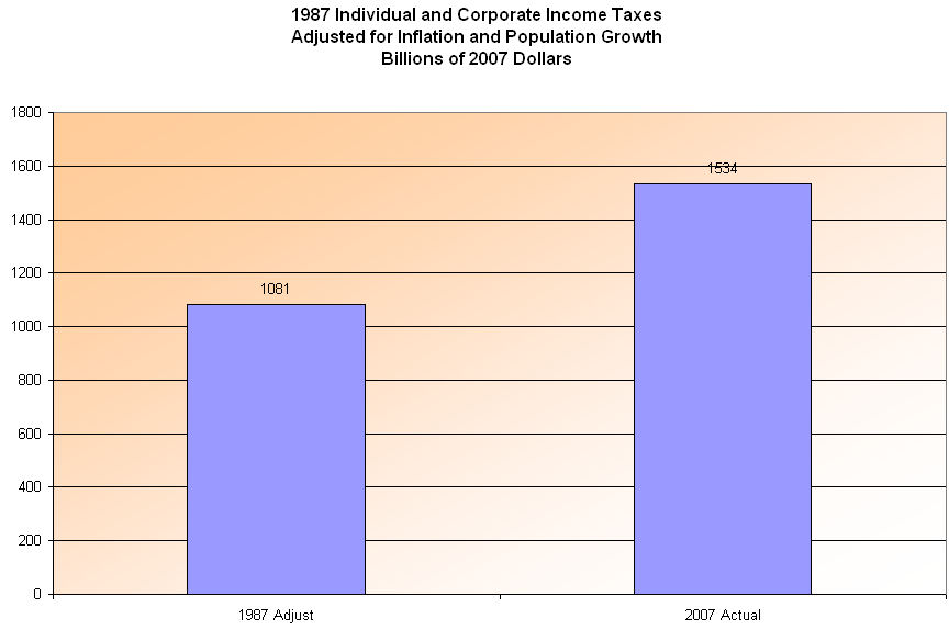 Below is a comparison of 1987 individual and corporate income taxes adjusted for inflation and population growth with the actual taxes collected in 2007.