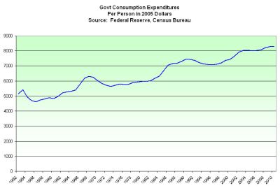 Below is a chart of per person federal, state and local spending in real, inflation-adjusted dollars. This does not include what are called transfer payments, like social security and unemployment checks the government sends out. More military spending, more social welfare programs, more health care programs, more regulatory agencies and it all adds up to a 60% per person increase over the past 60 years.