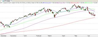 When these averages converge, the prudent long term investor might do well to wait a few weeks to a month to see where the market is headed before making any portfolio shifts. That initial move after the convergence usually signals where the market is going over the next year or several years. Many sites have stock charts. A free site with good charts is stockcharts.com. They allow 3 moving averages overlaid on the price chart. An ETF that captures almost all of the S&P500 index is SPY.
