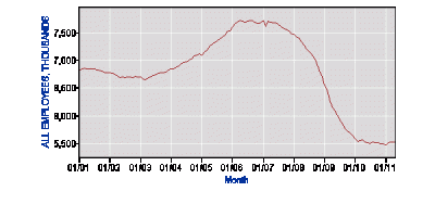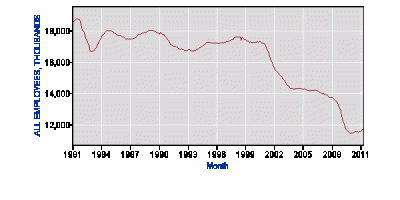 With the wave of my hand, I am going to magically undo the housing bust and add back the 2 million construction related jobs lost since the height of the real estate bubble. What is the unemployment rate in this fairy land? Still a high and unacceptable 7.7%. With another wave of my hand, I am going to add back in the 4 million manufacturing jobs that have disappeared during the past decade. What is the UI rate in this Never-Never Land? 5.3%. 6 million jobs magically added to the nation’s payrolls and the unemployment rate is STILL over 5%.