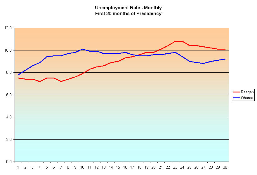 In previous blogs, I have compared this current recession to the recession(s) of the early eighties when Ronald Reagan was president. Obama has been in office for 30 months and I wondered what the unemployment rate was for Reagan’s first 30 months. (Click to enlarge in separate tab)