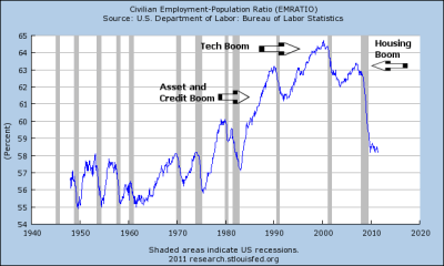 The average of this ratio over 60+ years is 59.2%. From January 1981 to December 2007, the average was 62.0%. This past June, this ratio declined further to 58.2%. The excruciating job of this recession is to take out the remaining excesses of the past three booms. An ideal ratio is probably closer to 60 – not too hot and not too cold. If we were to have that ratio, the civilian labor force would be 158 million, almost 5 million more than we have currently. If only 85% of those almost 5 million people were employed, we would have 4 million extra jobs and the unemployment rate would be just under 6%.