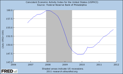 The Euro Zone may implode in 2012 and the political indecision both in the U.S. and Europe have caused many companies to be cautious in their investments and capital spending. The Coincident Economic Activity index sucks but is getting better.
