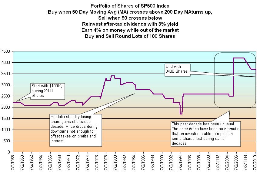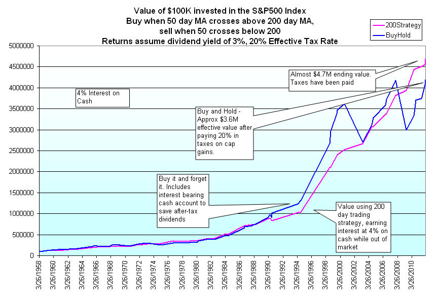 The lesson is that the downturn must be strong enough that the Golden Cross strategy can overcome the tax attrition by buying shares back at greatly reduced prices. Although the Golden Cross strategy produced only 5 losses out of 27 round trip (buy/sell) trades, a winning percentage of about 80%, the tax obstacle is a formidable barrier to increased profits over buy and hold. The buy and hold strategy is about 25% invested in cash at the end of this study, a conservative approach consistent with a buy and hold investor. If the buy and hold investor were to periodically reinvest dividends instead of holding cash, it would probably equal the after tax returns of the Golden Cross strategy.