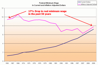How many people does the MW affect? Is it only those making the MW or does it also include those making just above MW? What is the effect on the local economy as well as local employment? Whatever you want to claim about MW, you can probably find a study in this area that will backup your claim. What we can know for certain is that the MW has declined in real dollars over the past 50 years. Using MW data from the Dept of Labor and a CPI calculator from the Bureau of Labor Statistics, I have graphed the minimum wage in both current dollars and real inflation-adjusted dollars.