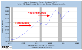 Which brings us to receipts, a gentle euphemism for taxes. Economic bubbles inflate the amount of tax revenue to the government but the resulting lack of revenues after the bubble bursts outweighs the increased revenue while the bubble was building.