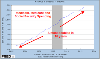Republicans contend that the real problem with the budget is entitlement spending: Medicare, Social Security and Medicaid are the largest programs. In the past ten years, spending on these three programs has almost doubled and now consumes 47% of the total Federal spending budget.