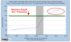 A fight between economists is not as exciting as a dinosaur smackdown (Jurassic Park), but the controversy can be as damaging. Politicians and pundits love to trot out those economic studies and theories which justify their actions or political point of view. In 2009, two economists Carmen Reinhart and Kenneth Rogoff (now affectionately known as RR), published a study which showed that a country’s GDP growth becomes slightly negative when its debt grows above 90% of its GDP. The study was cited by many politicians and pundits in Europe and the US, including VP candidate Paul Ryan, as they proposed various forms of austerity to curb the explosive growth of national debt.