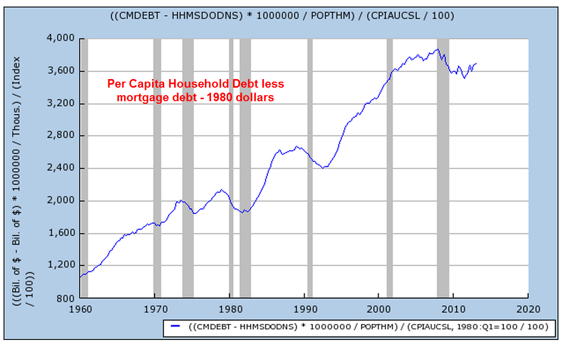 When we look at the non-mortgage portion of household debt, the rate of growth is more restrained – a mere 80% increase in per capita real dollars.