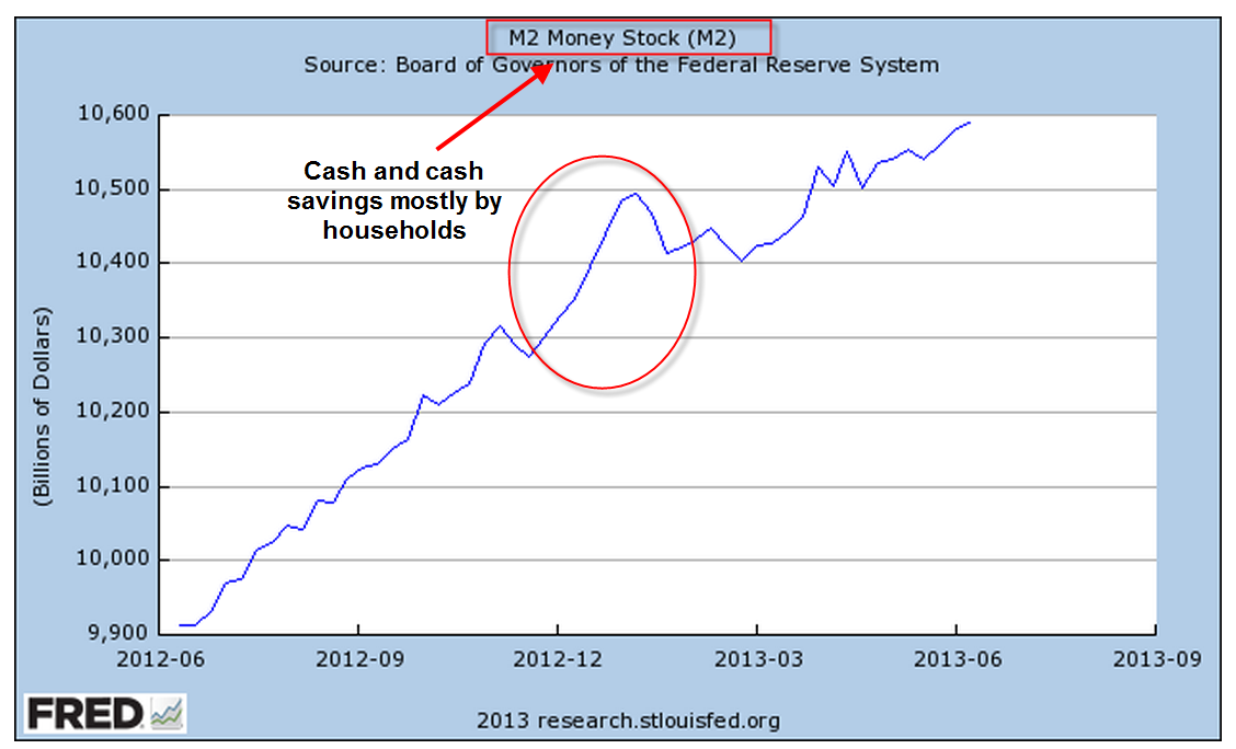 Households continue to keep ever higher balances in low yielding savings accounts and money market funds, indicating the high degree of caution. The big jump in deposits was probably due to higher dividends and bonuses paid in the last quarter of 2012 to avoid higher taxes in 2013.