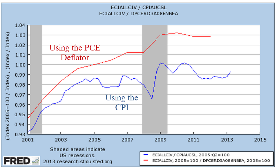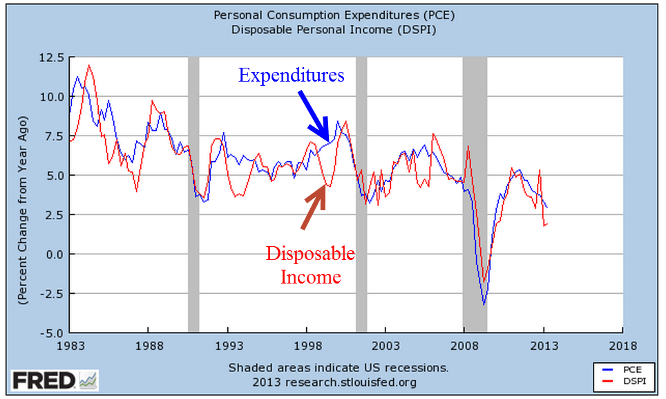 Income growth can be a bit more erratic than spending, bouncing around the more stable trend of spending.