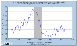 Since the temporary resolution of the government shutdown and the raising of the debt ceiling, the market has shot up over 6% in twelve trading days. The late release of September’s labor report showed less than expected net job gains of 148,000, which dashed any further fears that the Fed might ease their bond buying program this year. The trends of employment growth have been fairly stable, with a few exceptions – health care, for one.