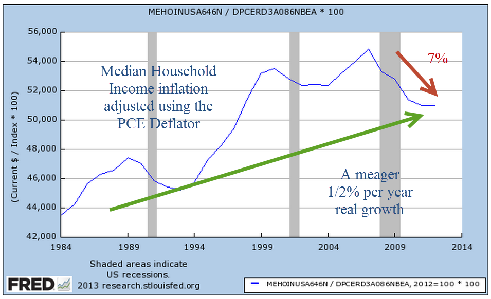 Let’s do some math. [5 million fewer workers paying into Social Security each year] x [$8000 guesstimated combined annual contribution] = $45 billion per year not collected. This is just the Social Security taxes, not including the income taxes, on a portion of the population that represents two thirds of the work force. That $45 billion represents the benefits paid to over 3 million people in 2012. (SSA Source) To put that figure in perspective, Congress is arguing over the medical device tax clause of Obamacare which is projected to raise just $29 billion over the next ten years.