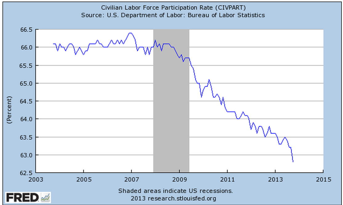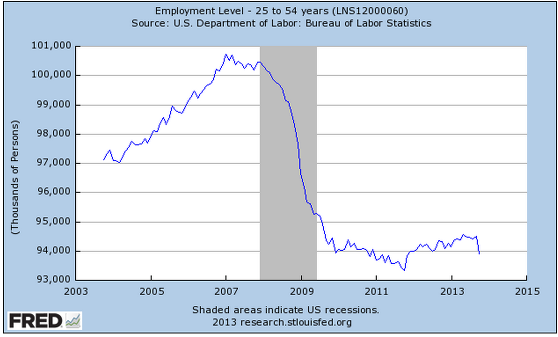 Employment in the core work force aged 25 – 54 actually dropped this past month. Classifications of employment by age, sex, and education come from the survey of households, not employers, and may have been affected somewhat by the goverment shutdown. But the numbers of the past years show that there has been no recovery for this segment of the population. In each lifetime, there are stages that last approximately twenty years. This time of life should be about building careers, building families, building assets and growing income. I fear that for too many people in this age group, the slowly growing economy has not been kind. This affects both a person’s current circumstances and dampens prospects for the future.