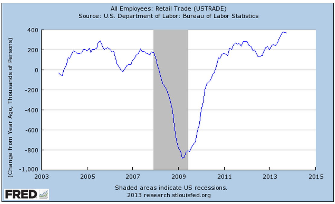 There were some strong positives as well in this report. Retailers added 44,000 jobs, above the average gains of 31,000. This year’s gains have been the strongest in fifteen years.