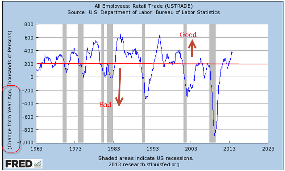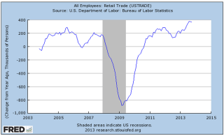 The gains are about half of the eye-popping gains of the past fifty years, but they indicate a confidence among retailers. Retail jobs are often the first job of many younger workers, who have endured persistently high unemployment during this recession. Here’s a glance at yearly job gains in the retail sector for the past fifty years.