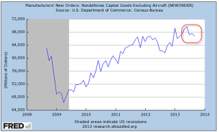 In a catch up effort after the recent government shutdown, the Dept of Commerce released data on factory orders for both August and September. While the manufacturing sector as a whole has been strong, the weakness in new orders in these two months indicates a tempering of industrial production in the near future.