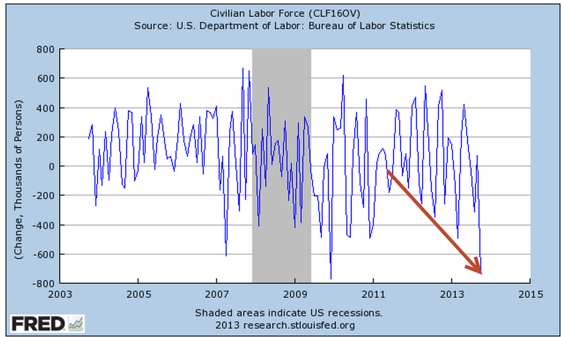 The first number popping in the employment report is the 702,000 people who dropped out of the labor force. To put that number in perspective, take a look at the chart below which shows the monthly changes in the labor force for the past ten years. This is the second worst decline after the decline in December 2009, shortly after the official end of the recession.