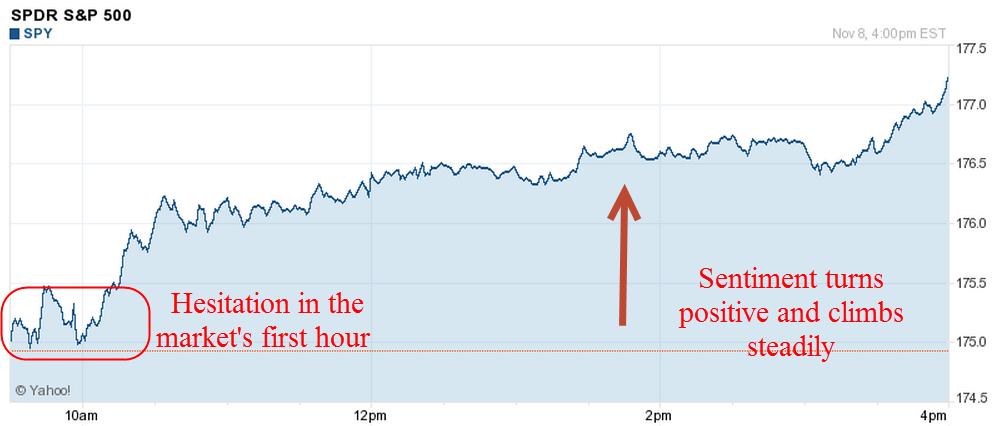 On Friday, the employment report was released an hour before the market opened. Trading began at the same level as Thursday’s close with little response to the strong job gains. We can imagine that traders were twittering furiously to each other in the opening hour, trying to gauge the sentiment. Buy in on strength in the employment numbers or sell on the strength in the employment numbers? After the initial hesitation, the main index gained continuing momemtum throughout the day, with a final spike at the closing bell.