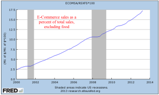 Last week I pointed to several contradictory outlooks for sales in the upcoming holiday season.  Bill McBride at Calculated Risk has several charts on the import and export volume at the port of Los Angeles.  The import data indicates that businesses were buying goods in late summer and the fall in anticipation of a good holiday season.  Both Home Depot and Best Buy reported better than expected earnings on Tuesday but Best Buy’s sales were less than expected.  The company cited increasing pressure from online retailers.  E-Commerce continues to take an ever increasing share of the retail sales market.