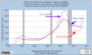 From 1983 to 1999, the average house cost 13 to 15 years worth of rent.  This baseline is a good rule of thumb when pricing out houses.  In 2006, at the height of the housing bubble, houses were selling for 25 years worth of the average monthly rental.  Los Angeles experienced a much greater price inflation during the 2000s than either SF or NYC.  Although the nationwide economy is growing steadily but slowly, Los Angeles has responded to the strong growth in manufacturing throughout the country. Asking rents for industrial properties in L.A. are rocketing upward this year, accelerating from the strong three year growth and exceeding the price levels of 2007.