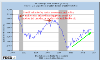 It may be several more years before job openings reach the level attained during the tech boom of the late ’90s.  Like the gold fever of the mid-19th century, investors poured money into a lot of ventures with little more than a napkin sized business plan.  This pattern of bubble and bust is fairly typical when game changing technologies emerge.  The spread of the telegraph and railroads led to horrific recessions in the late 19th century, culminating in the depression of 1893-94.  The rise of radio in the 1920s prompted speculative fever that contributed mightily to the crash of 1929, setting the stage for the bad monetary policy and haphazaard fiscal policies that fed the depression of the 1930s.  In the 1960s, a rush of investment in airlines and war funding helped fuel a frenzy of speculation that crashed in 1970.