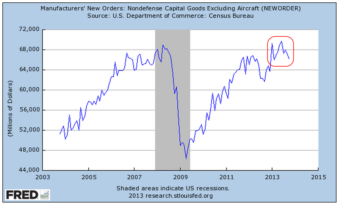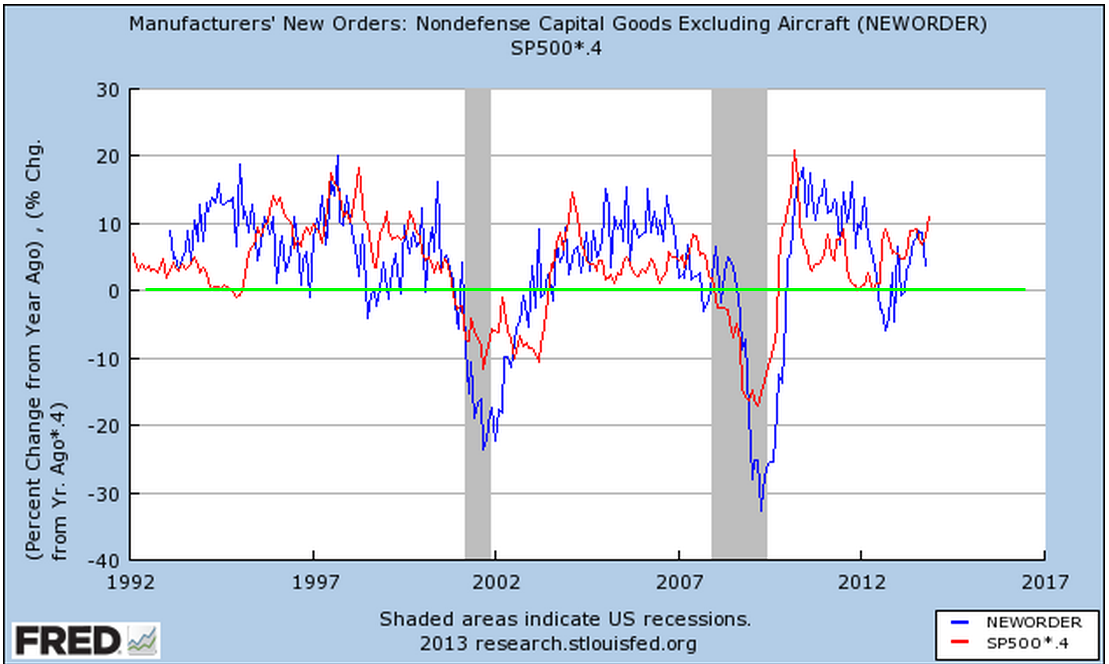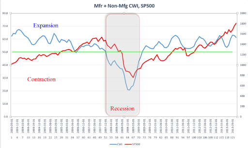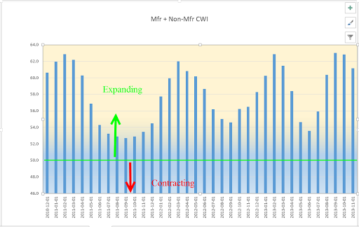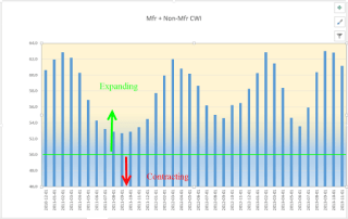 The November report from the Institute for Supply Management (ISM) showed strong to robust growth in the both the manufacturing and services sectors. As I noted this past week, I was expecting the composite CWI index of these reports that I have been tracking to follow the pattern it has shown for the past three years. Within this expansion, there is a wave like formation of surging growth followed by an easing period that has become shorter and shorter, indicating a growing consistency in growth. The peak to peak time span has decreased from 13 months, to 11 months to 7 months. The index showed a peak in September and October so the slight decline is following the pattern. IF – a big if – the pattern continues, we might expect another peak in April to May of 2014.