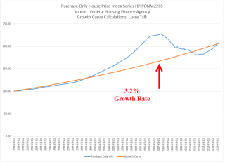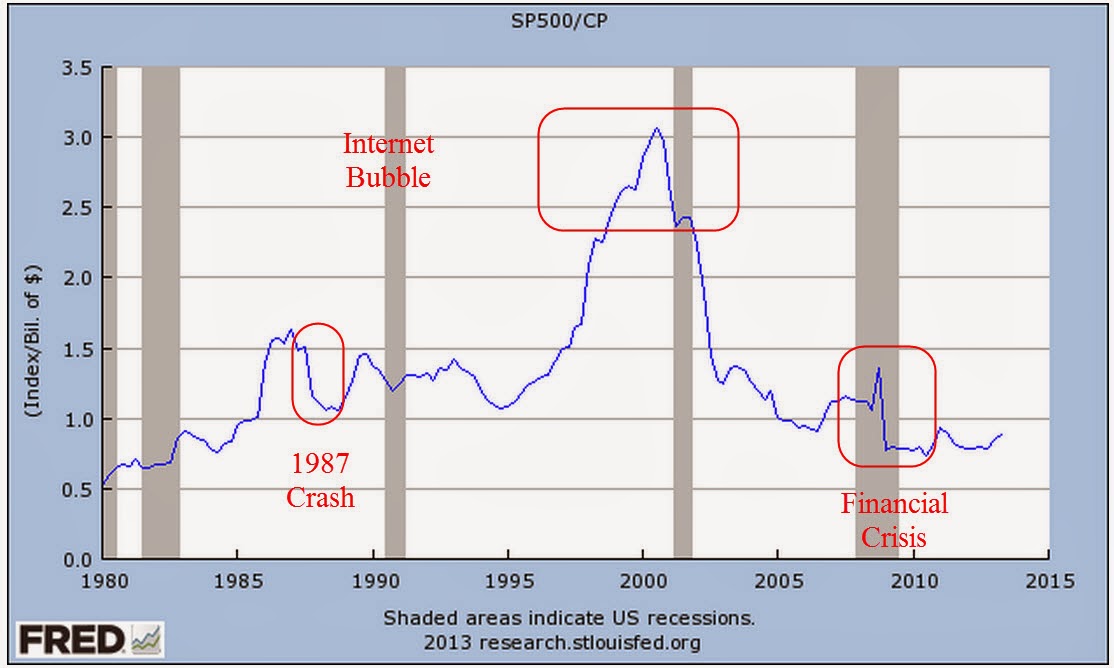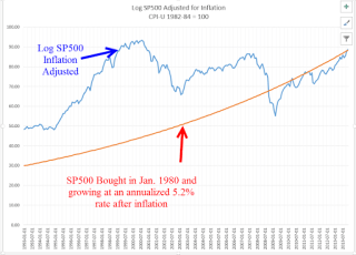 How frothy is the market? I took the log of the SP500 index since January 1980 and adjusted it for inflation using the CPI index. I then plotted out what the index would be if it grew at a steady annualized rate of 5.2%. Take 5.2%, add in 3% average inflation and 2% dividends and we get the average 10% growth of the stock market over the past 100 years. The market doesn’t look too frothy from this perspective. In fact, the financial crisis brought the market back to reality and since then, we have followed this 100 year growth rate.