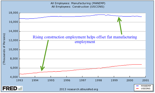 During the 90s, a rise in construction jobs helped offset moribund growth in manufacturing employment.