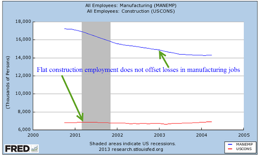 As the economy began recovering in late 2003, the rise in construction jobs more than offset the steadily declining employment in the manufacturing sector. People losing their jobs in manufacturing could transition into the construction trades.