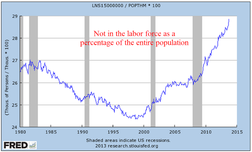 In a healing job market, those aged 16 and up who are not in the labor force as a percent of the total population continues to climb.