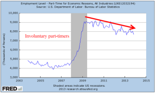 Discouraged job seekers are declining as well. The number of involuntary part time workers fell by 331,000 to 7.7 million in November. As shown in graph below, the decline is sure but slow.