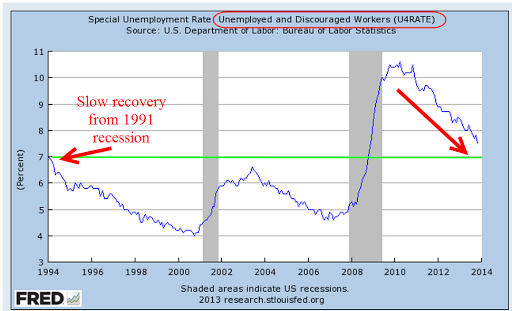 A broader measure of unemployment which includes those who want work but haven’t looked for a job in the past four weeks declined to 7.5%. This is still above the high marks of the recessions of the early 90s and 2000s.