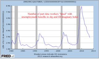 At its worst in the second quarter of 2009, the unemployed plus those involuntary part timers totaled 24 million, almost 16% of those in the labor force. 8 million were effectively “hired” to dig imaginary holes. In the long run, what will be the net effect of paying people to dig holes and fill them? First of all, a politician can’t indulge in long run thinking. In a crisis, most politicians will sacrifice long run growth so that they can appease the voters and keep their own jobs.