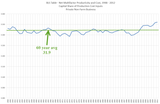 Part of that recovery can be attributed to the market simply reversing the decline of 2008 and early 2009, but a good 40% increase in market value can be attributed to the greater share of output that companies have been able to convert to profit. (See last week’s blog) How long that trend can and will continue is anyone’s guess but we know that it can not go on forever. Flat revenue growth makes growing profits an ever more difficult task.