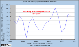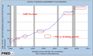 The summer of 2009 marked the official end of this past recession. For five years there has been no increase in real GDP per hour worked. For a few years following a recession in the early 1990s, per hour GDP flattened before taking off in the late 1990s.