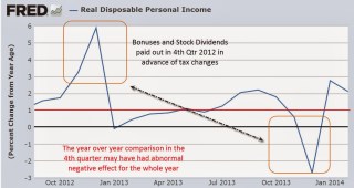 A few weeks ago I noted that annual DPI had dropped below 1% in 2013. Contributing to the weak year over year comparison was the high spike in income in the fourth quarter of 2012 when many companies “paid forward” both dividends and bonuses in December in advance of tax increases scheduled for 2013.