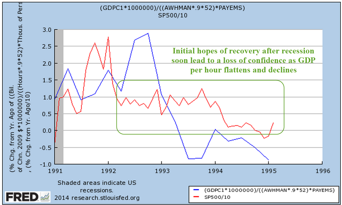 Let’s look a bit more closely at recent periods of flat growth. The recovery from the recession of 1991 was marked by a painfully slow recovery in the job market. After a 30% rise over three years, the market stumbled.
