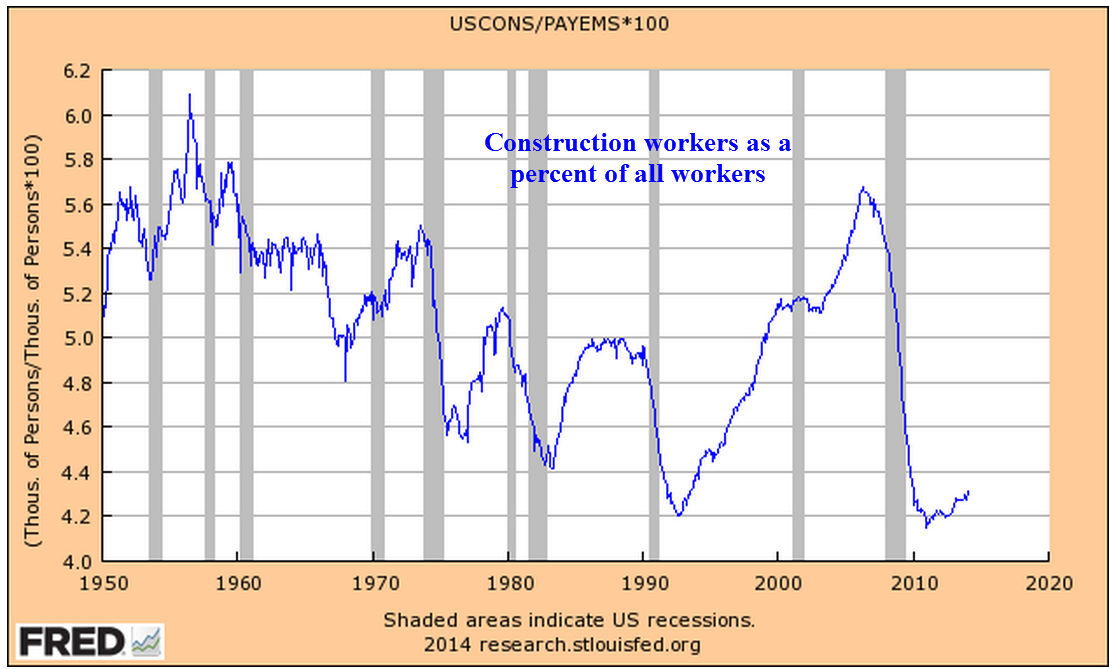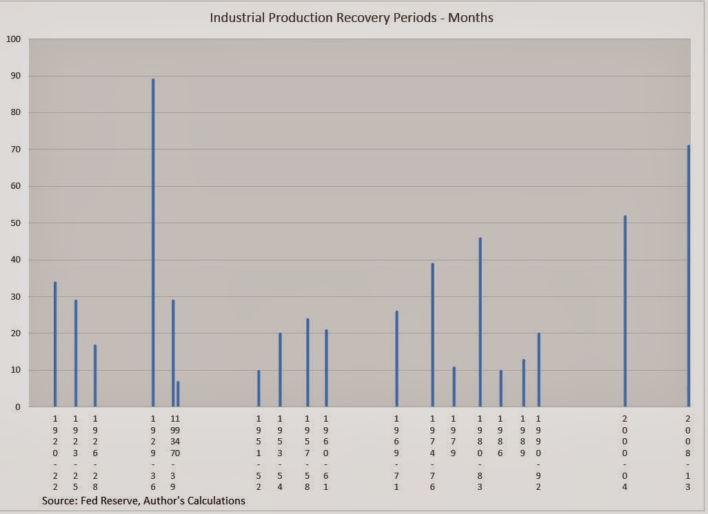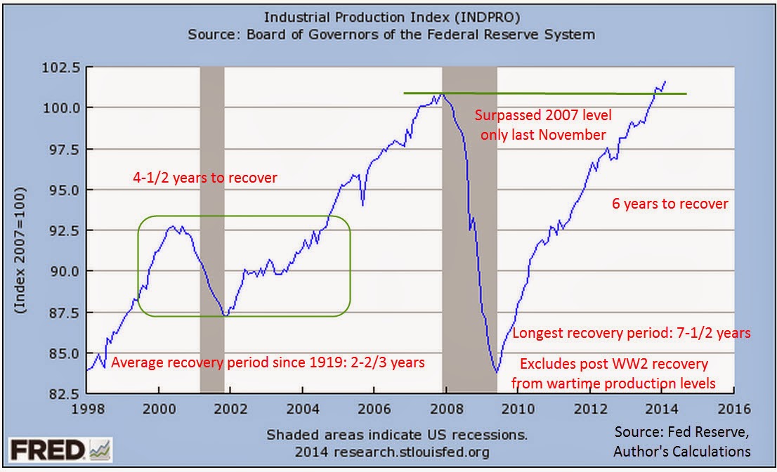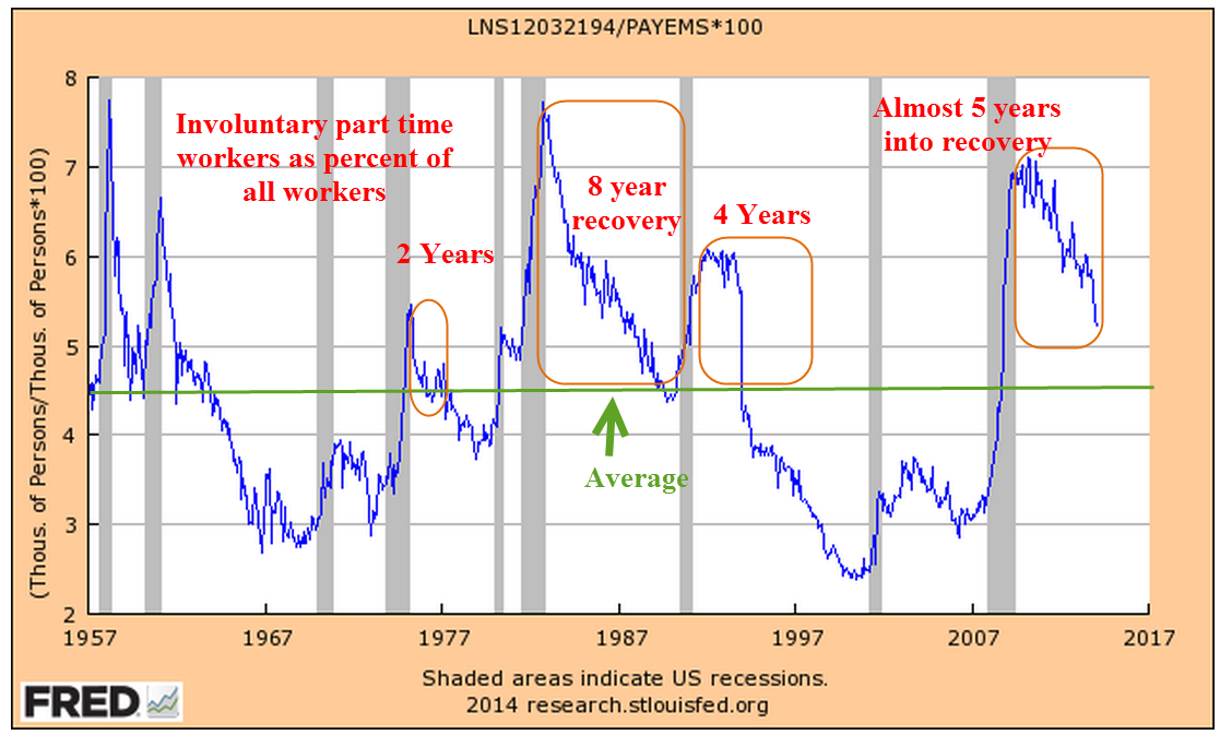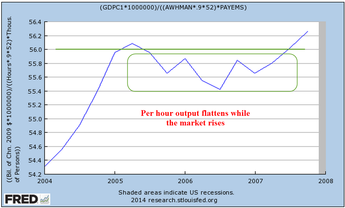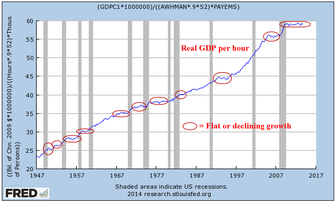 The summer of 2009 marked the official end of this past recession. For five years there has been no increase in real GDP per hour worked. For a few years following a recession in the early 1990s, per hour GDP flattened before taking off in the late 1990s.