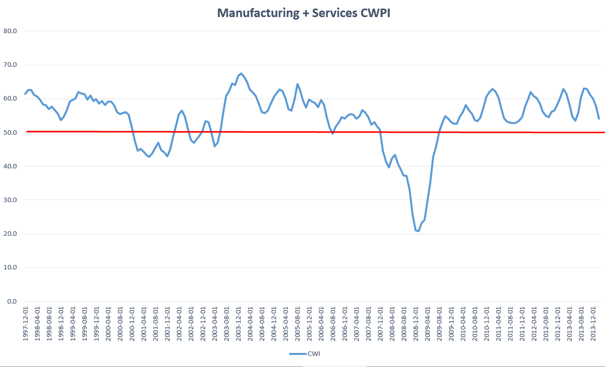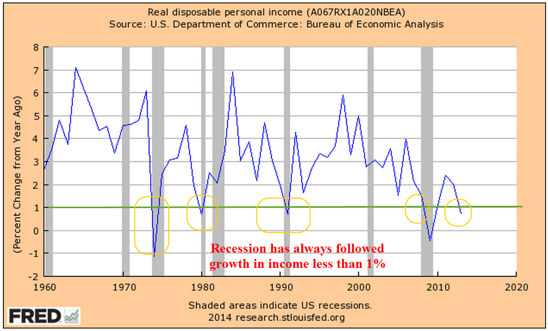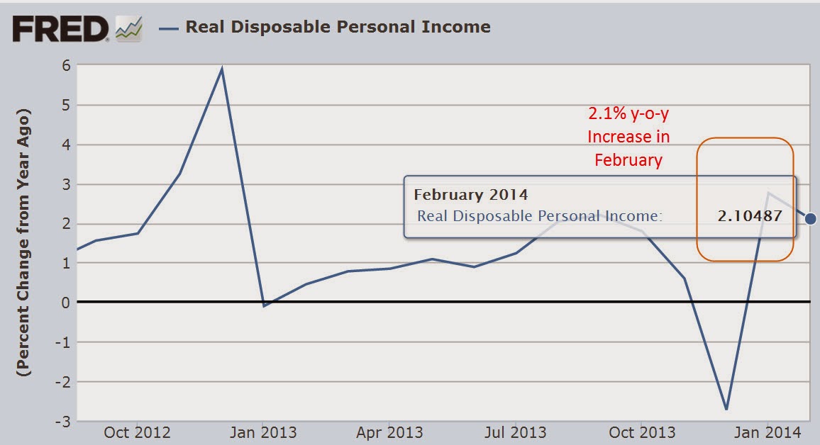A few weeks ago I noted that annual DPI had dropped below 1% in 2013. Contributing to the weak year over year comparison was the high spike in income in the fourth quarter of 2012 when many companies “paid forward” both dividends and bonuses in December in advance of tax increases scheduled for 2013.