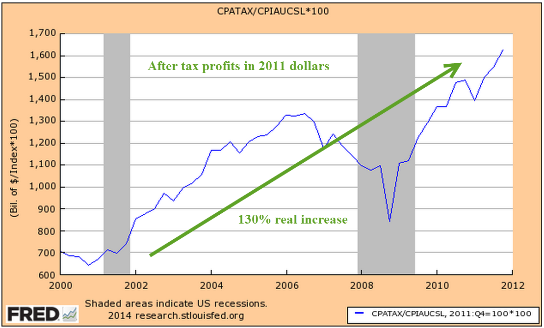 Part of that recovery can be attributed to the market simply reversing the decline of 2008 and early 2009, but a good 40% increase in market value can be attributed to the greater share of output that companies have been able to convert to profit. (See last week’s blog) How long that trend can and will continue is anyone’s guess but we know that it can not go on forever. Flat revenue growth makes growing profits an ever more difficult task.