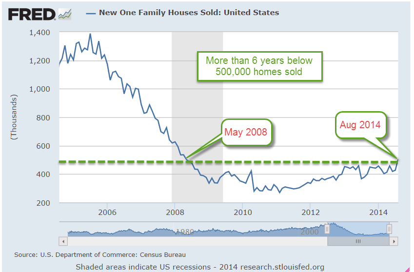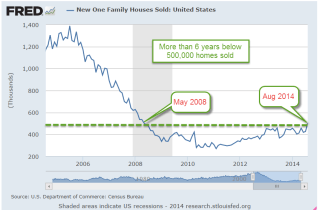 At the kitchen table, George turned on the computer while he chewed his carrots and celery. He had never been fond of vegetables but found that his likes and dislikes had mellowed with age. He liked that Mabel cared. The market helped distract him from the vegetables. He paged through the daily calendar at Bloomberg, then checked out the headlines at Yahoo Finance. Existing home sales in August had fallen more than 5% from the previous August but that was a tough comparison because 2013 had been a pretty strong year. Existing home sales were still above 5 million.