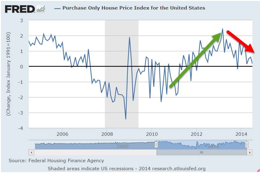 He sat down to eat, wondering what all the fuss in the market was. Checking the Bloomberg Calendar, he saw that it was the House Price index from the Federal Housing Administration that had dampened spirits. The monthly change was drifting down to zero, a sign of weakness. Although housing prices were still rising, the rise was slowing down.