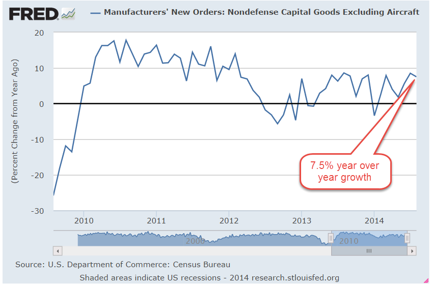 He followed her into the house and broke into a big grin when he saw what was for lunch. “Tuna fish!” Mabel had dressed up her famous tuna fish salad with lettuce, tomatoes, some green onions and put it open faced on some toasted bread. It was scrumptious. Not so the market. The SP500 was down about 1-1/2% on several news releases. The whopper was that Durable Goods Orders were down 18% in August from the previous month. But most of that drop was a decline in aircraft orders after a surge in those same orders in July. Aircraft orders were notoriously volatile. Year-over-year gains in non-defense capital goods, the core reading, were up almost 8%.