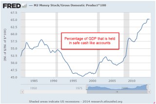 George wouldn’t tell her one thing that concerned him. It was a long term phenomenon, a growing caution that George attributed to the aging of the population. People put money in safe money accounts like savings, CDs, money markets, and checking when they were less confident about the future or anticipated a short term need for cash. On the second point, it was true that as people got older, they prudently put more money in safe accounts. Retired people in particular were encouraged to keep five years of anticipated withdrawals in a safe place, not the stock market. The Federal Reserve tracked the amount of these safe money accounts, known as the M2 money supply. Occasionally, George would look at this amount as a percent of GDP. Over the past decade the percentage of M2 to GDP had been growing.
