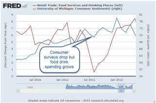2011 is an indication of the opposite – plunging sentiment according to a survey but growing spending at food and drink establishments, indicating that the volatile drop in sentiment might be short lived. The plunge in confidence was a response to the budget battles between the Republican House and the President.